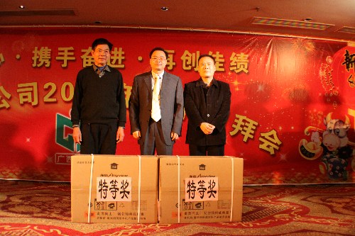 春節(jié)團拜會上公司董事長黃鼎龍(中)給抽中特等獎的員工發(fā)獎并合影留念